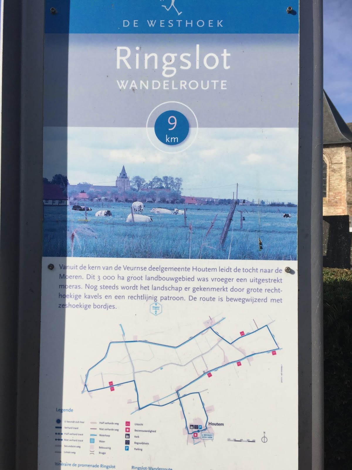 wandelen aan de rand van de verdronken hooilanden langs de Heidebeek, een zijwatertje van de IJzer, en zien de kerk van West-Vleteren in de